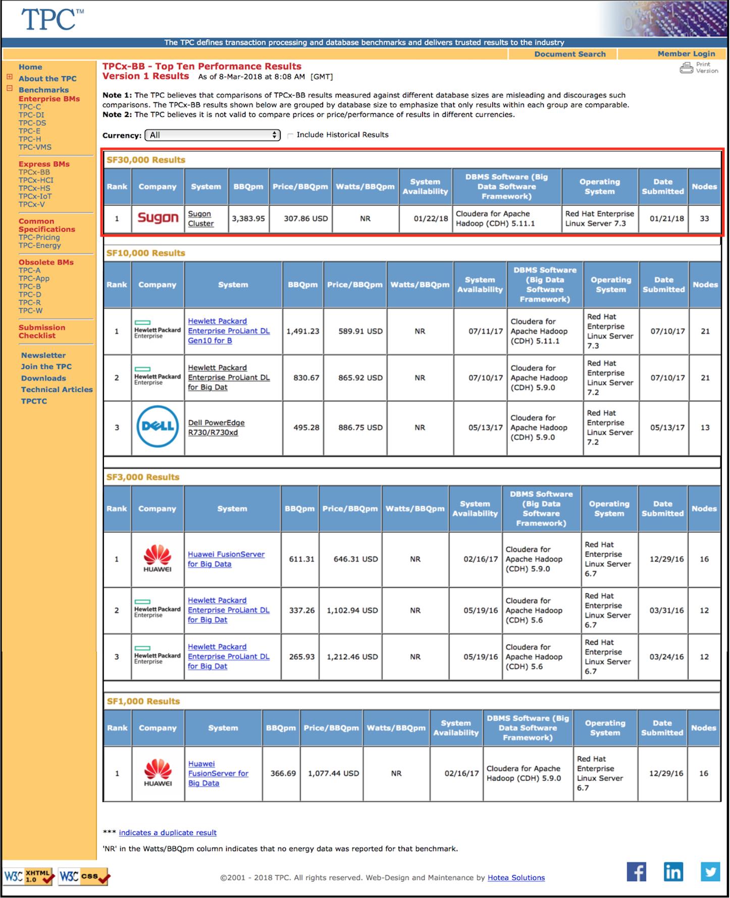 Today, Sugon publishes a result of Sugon cluster with I620-G30 servers, which breaks two world records of performance and price/performance set by TPCx-BB, in the field of Big Data technologies on TPC website. The performance that reaches a high big data query speed of completing 3383.95 BigBench queries per minute and the price/performance that reaches $307.86 for each BigBench query per minute are all ranked No.1 among all the published results in the world. The result reflects extremely robust data processing capacities and the most amazing cost efficient of Sugon servers. The following is a screenshot from TPC website(www.tpc.org):